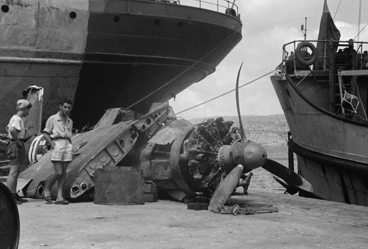 Sur le quai du port de Suda Bay, la carcasse d'un hydravion Arado Ar-196, attend son transfert.