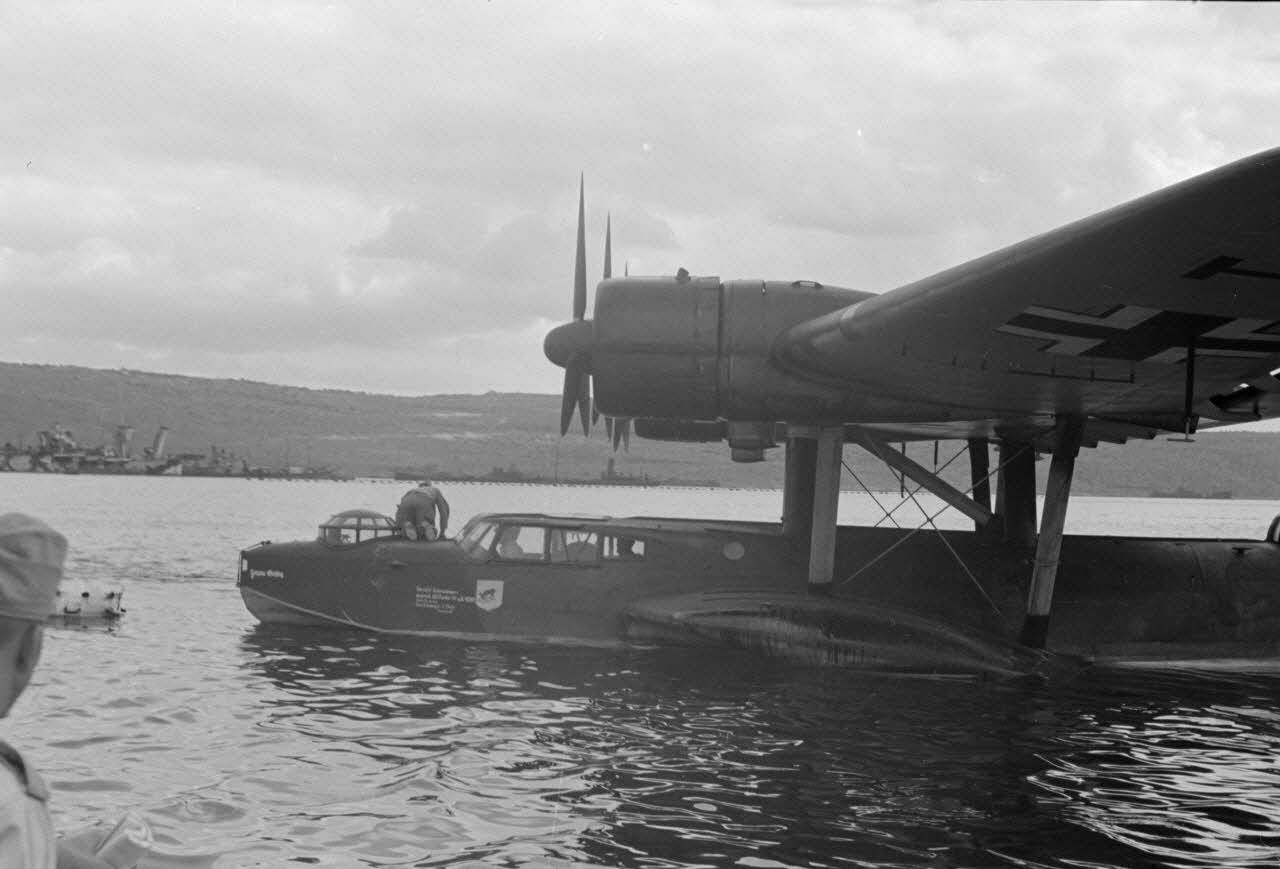 Un Dornier Do-24 et un hydravion Junkers W-34 d'une unité côtière non-identifiée de l'armée de l'Air allemande. Des mécaniciens effectuent une maintenance sur des Arado Ar-196 du 126e groupe de reconnaissance (Aufklärungsgruppe 126). On remarque l'immatriculation de l'Arado D1+ GI. Dans un port, la vedette de la Luftwaffe imamtriculée FL.B.435 Flugsicherungsboot (DAM 1436 L11). Dans un port, des futs et des jerrycans sont déchargés d'un cargo. La carcasse d'un bombardier Junkers Ju-88 du 121e groupe de reconnaissance (Aufklärungsgruppe (F)121) immatriculé 7A+BH (DAM 1436 L23 et L24). La carcasse d'un hydravion Arado Ar-196 a été déchargé du cargo. On remarque le début de l''immatriculation "D1" qui identifie les avions du 126e groupe de reconnaissance. Une vedette rapide (Schnellboot) de la 3e Flotille dont on aperçoit l'insigne qui semble être un crocodile (DAM 1436 L29 à L30).
