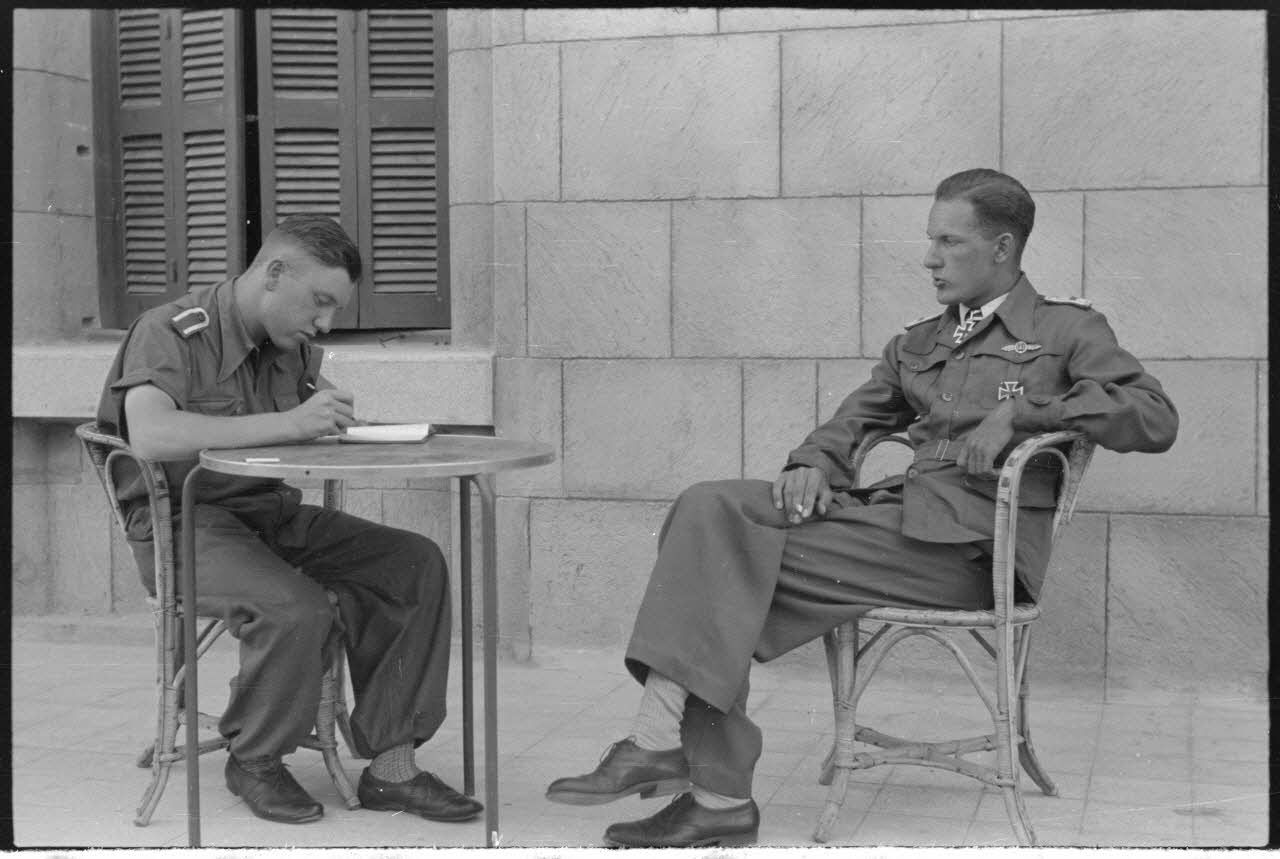 Le reporter de la presse écrite semble être le Wortberichter Kanitz interroge Josef Wenigmann du Sturzkampfgeschwader 3 (I-StG-3) récipiendaire de la croix de chevalier de la croix de fer (Ritterkreuz).