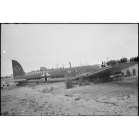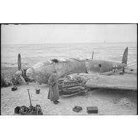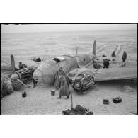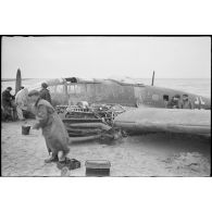 Des civils inspectent les nacelles moteur d'un avion de bombardement Heinkel He-111 du KG-26,…