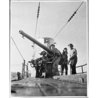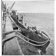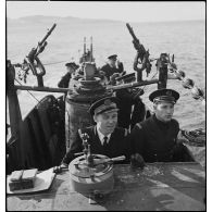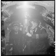 Le lieutenant de vaisseau Pierre Sonneville (au périscope), commandant la Minerve, et l'officier de…