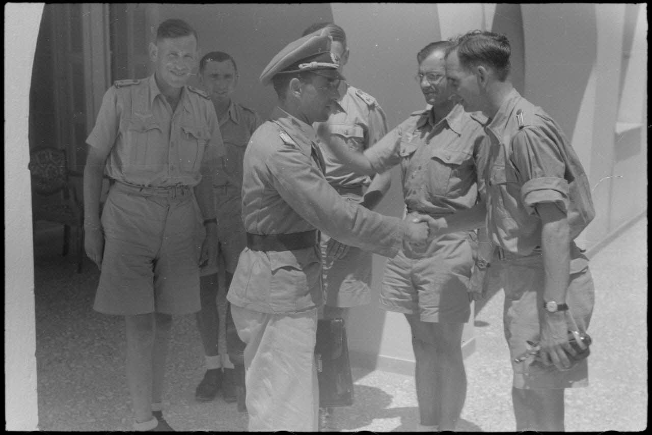 Le commandant (Major) Heinrich Schüler salue des hommes, ici un Sonderführer de la compagnie de propagande.