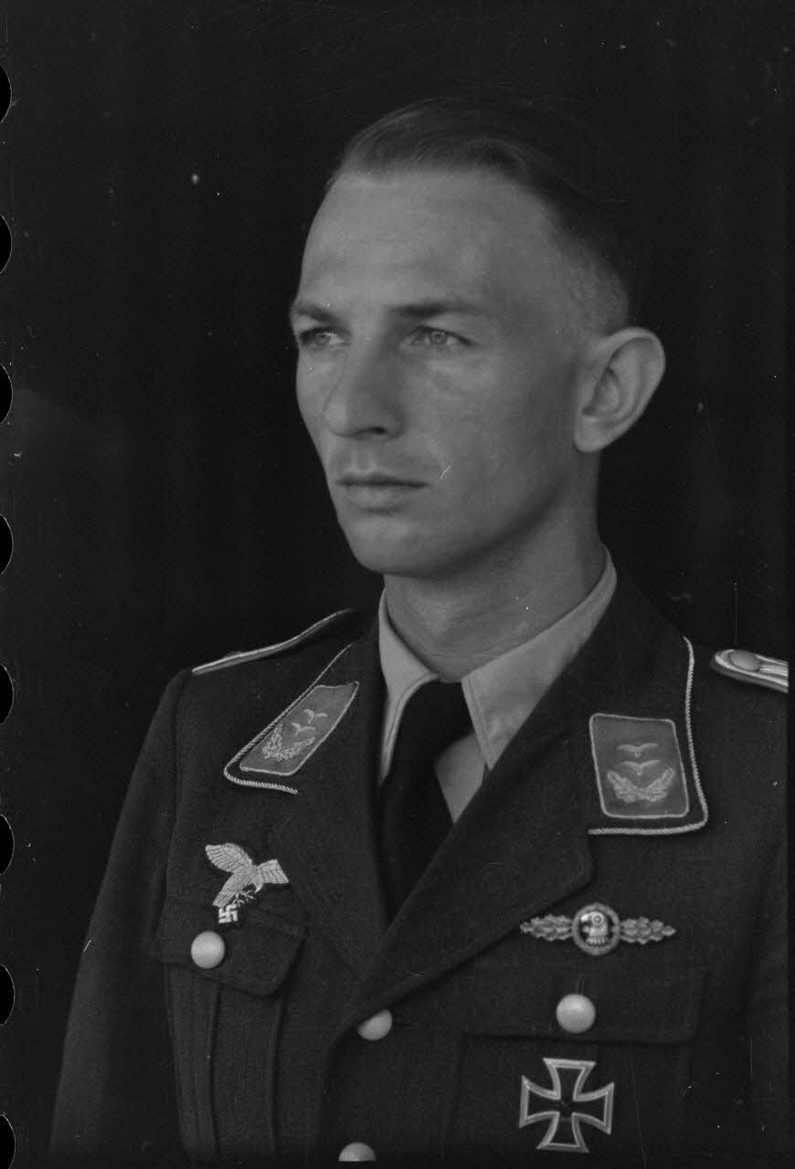 Le lieutenant (Oberleutnant) Heimo Emmerstorfer, I./NAGr. 12 (Nahaufklärungsgruppe 12). On remarque sa bande de bras (Armelband) "Tannenberg" issu du Aufklärungsgruppe 10.