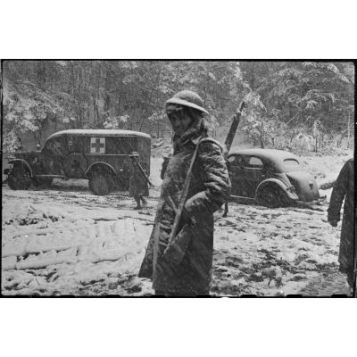 Goumier du 2e GTM dans la forêt vosgienne enneigée lors de la progression de la 3e DIA vers Rochesson.