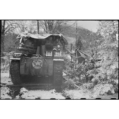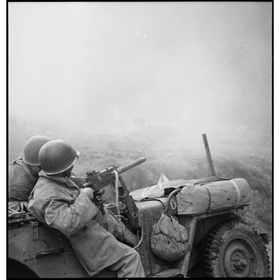 Soldats de la 3e DIA en patrouille de reconnaissance dans les Vosges avant l'offensive lancée le 3 novembre 1944 vers Rochesson à bord d'une jeep équipée d'une mitrailleuse Browning 7,62 mm 1919A4.