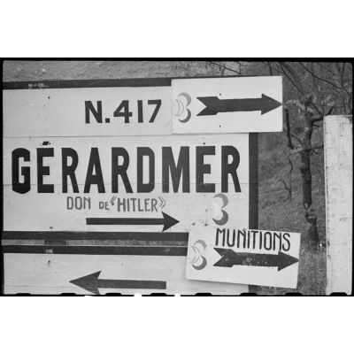 Panneaux de signalisation dans le secteur de Gérardmer occupé par la 3e DIA (division d'infanterie algérienne). L'emblème de la division est apposé sur les pancartes.
