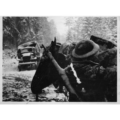 Goumier du 2e GTM dans la forêt vosgienne enneigée lors de la progression de la 3e DIA vers Rochesson.