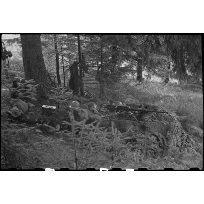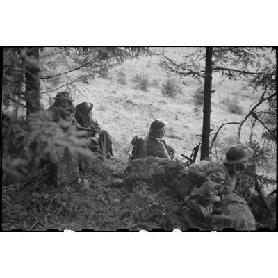 Goumiers du 2e GTM à leur poste de guet dans la forêt vosgienne lors de la progression de la 3e DIA vers Rochesson.