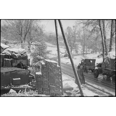 Eléments de la 3e DIA (division d'infanterie algérienne) lors de la progression de l'unité vers Rochesson entre le 3 et le 5 novembre 1944. Au premier plan, des caisses de munitions.