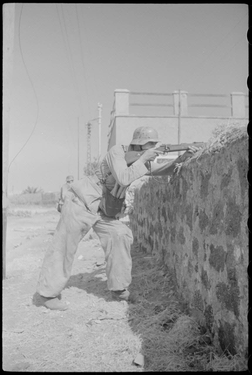 A Catane (Sicile) ou dans la banlieue de la ville, un fantassin du Panzergrenadier-Regiment Hermann Goering épaule son fusil Mauser 98k.