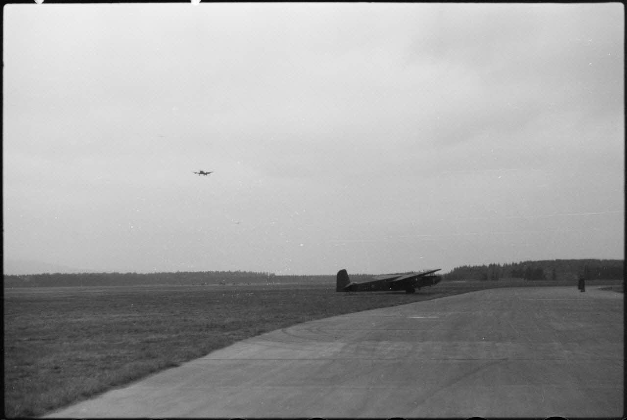 Lors d'un exercice aéroporté sur un aérodrome norvégien, un planeur DFS-230 descend en piqué.