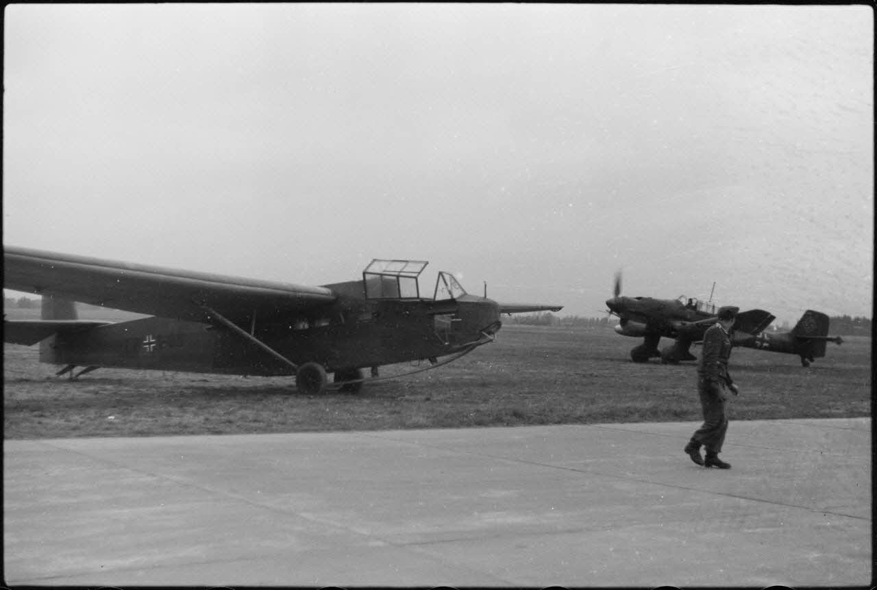 Un Junkers Ju-87 utilisé comme tracteur de planeur DFS-230 sur un terrain d'aviation norvégien occupé par le Luftlandegeschwader 1 (8.LLG1).