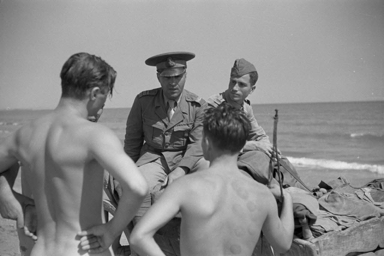 A proximité du terrain de Mamaia, des pilotes roumains du Grupul 9 sur une plage de la Mer Noire.