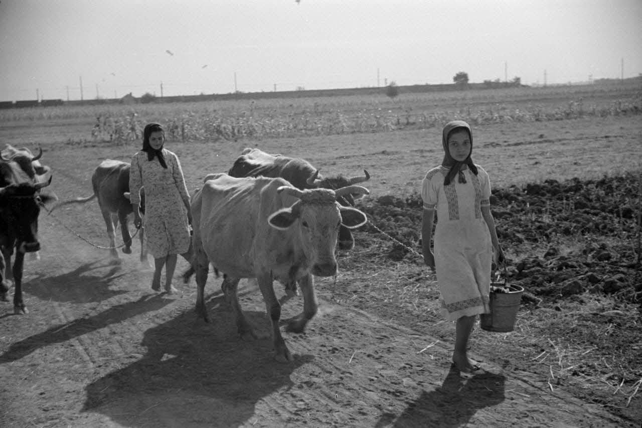 Des jeunes femmes et des bovins à proximité du terrain roumain de Mamaia.