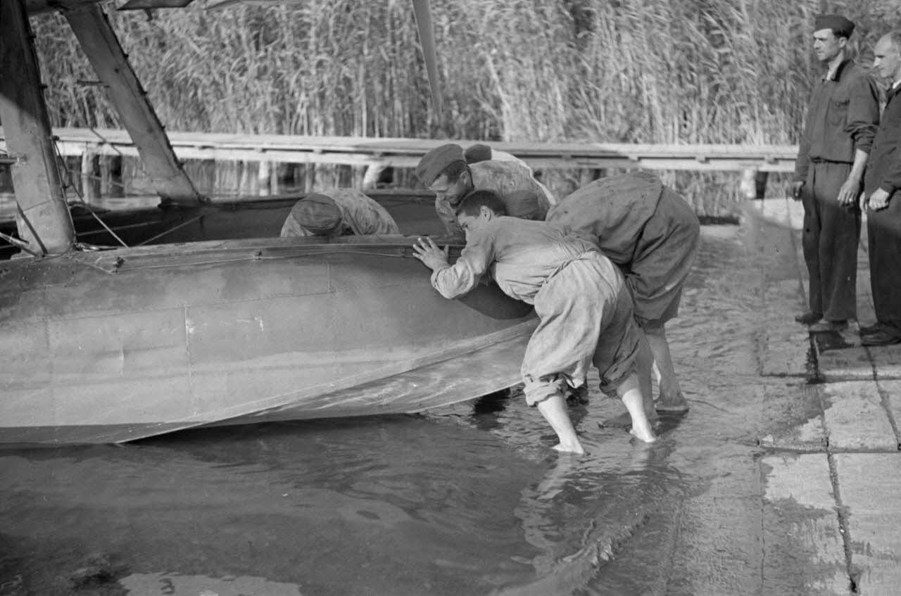 Un tableau en ardoise présente le programme des activités du 7 septembre 1942. Un mécanicien roumain approvisionne l'arme de bord d'un hydravion Heinkel He-114 de l'armée de l'air roumaine. Un pilote roumain s'équipe pour une mission. Un hydravion aux couleurs roumaines, il pourrait s'agir d'un Savoia Marchetti S.59. Un hydravion Heinkel He-114 à quai. Un hydravion roumain quitte son port. Un pilote roumain avec un fusil de chasse. Décollage de deux hydravions Heinkel He-114, un exemplaire roumain et un Heinkel He-59 de la Luftwaffe. Un membre de la 9e escadrille de chasse roumaine, comme l'atteste le trèflle cousu sur sa poitrine. Peut-être un photographe de l'armée de l'air roumaine, ou simplement un officier équipé d'un boitier photographique. Le même officier portant un appareil photo et saluant le reporter lors du décollage. Vue aérienne du terrain et des hangars lors du décollage. On reconnaît distinctement les hangars caractéristiques du terrain de Mamaia.