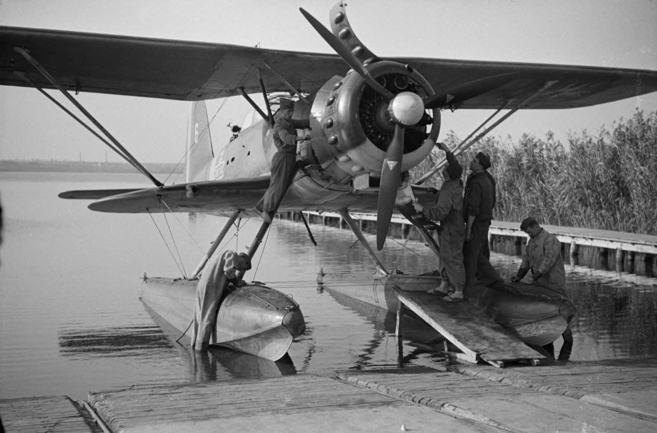 Un tableau en ardoise présente le programme des activités du 7 septembre 1942. Un mécanicien roumain approvisionne l'arme de bord d'un hydravion Heinkel He-114 de l'armée de l'air roumaine. Un pilote roumain s'équipe pour une mission. Un hydravion aux couleurs roumaines, il pourrait s'agir d'un Savoia Marchetti S.59. Un hydravion Heinkel He-114 à quai. Un hydravion roumain quitte son port. Un pilote roumain avec un fusil de chasse. Décollage de deux hydravions Heinkel He-114, un exemplaire roumain et un Heinkel He-59 de la Luftwaffe. Un membre de la 9e escadrille de chasse roumaine, comme l'atteste le trèflle cousu sur sa poitrine. Peut-être un photographe de l'armée de l'air roumaine, ou simplement un officier équipé d'un boitier photographique. Le même officier portant un appareil photo et saluant le reporter lors du décollage. Vue aérienne du terrain et des hangars lors du décollage. On reconnaît distinctement les hangars caractéristiques du terrain de Mamaia.