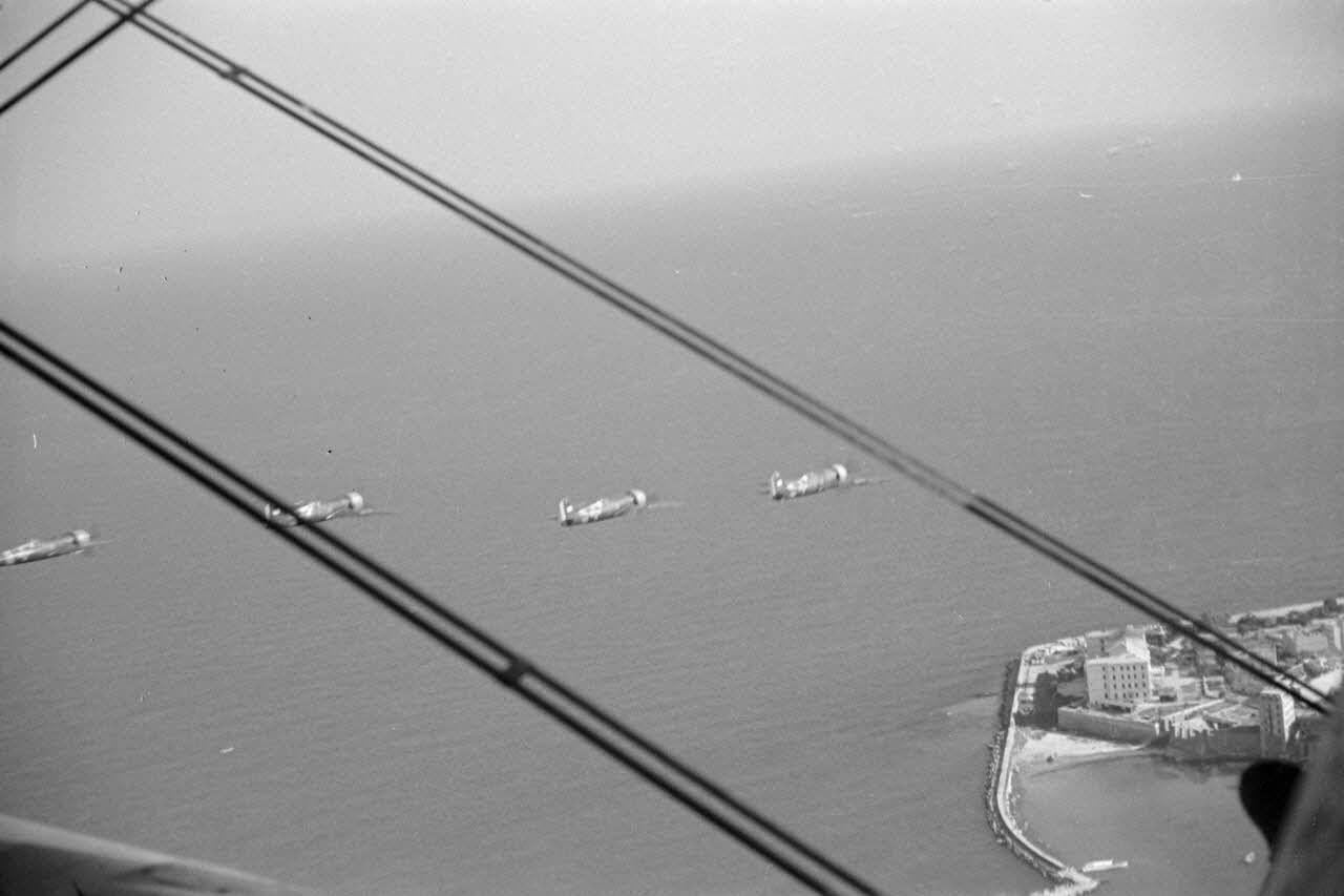 Photographiés depuis un biplan, l'évolution dans le ciel de chasseurs roumains IAR 80 de la 9e escadrille de chasse roumaine.