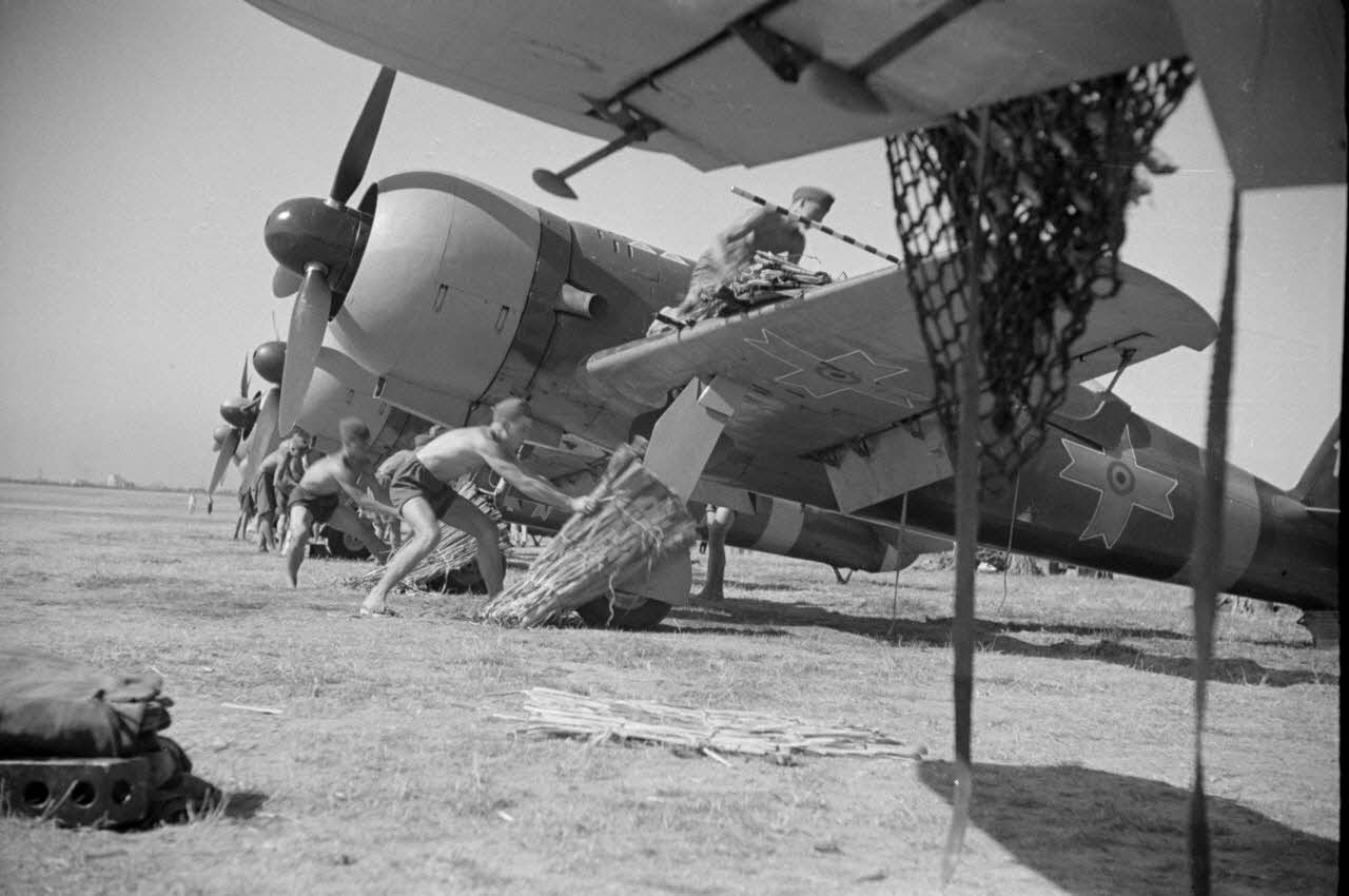 Les mécaniciens du groupe de chasse préparent les avions IAR 80 qui portent les numéros : "178" ou "170", "132" et "137". On note également quelques noms de baptème comme "Félicia" (DAA 2619 L05 et L06) sur le chasseur IAR 80 portant le numéro 131. Dans un hangar, des mécaniciens s'affairent sur des chasseurs Messerschmitt Bf-109 d'origine allemande. Des pilotes roumains courent vers leur chasseur IAR 80, on note les numéros des avions : "137" et "132", "146". Derrière les chasseurs roumains, un Mersserschmitt Bf-109 avec le numéro 1.