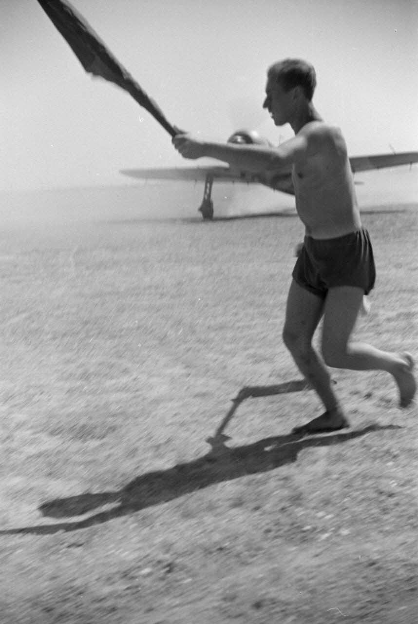 Sur le terrain de Mamaia (Roumanie), un pilote à bord d'un chasseur IAR 80 est aidé lors de son atterrissage.