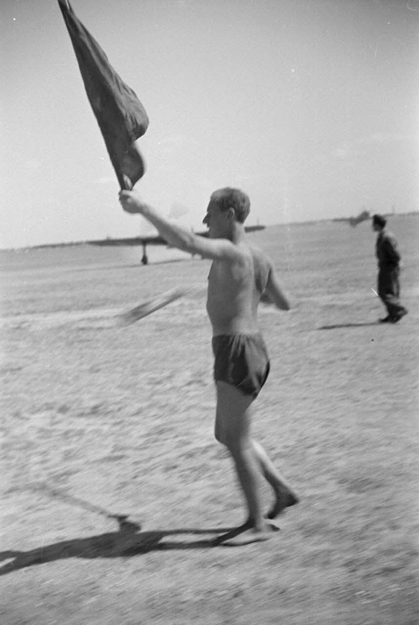 Sur le terrain de Mamaia (Roumanie), un pilote à bord d'un chasseur IAR 80 est aidé lors de son atterrissage.