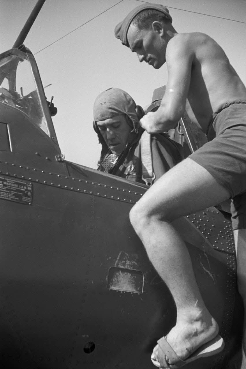 Un mécanicien et un pilote du Grupul 9 se préparent pour une nouvelle mission aérienne.
