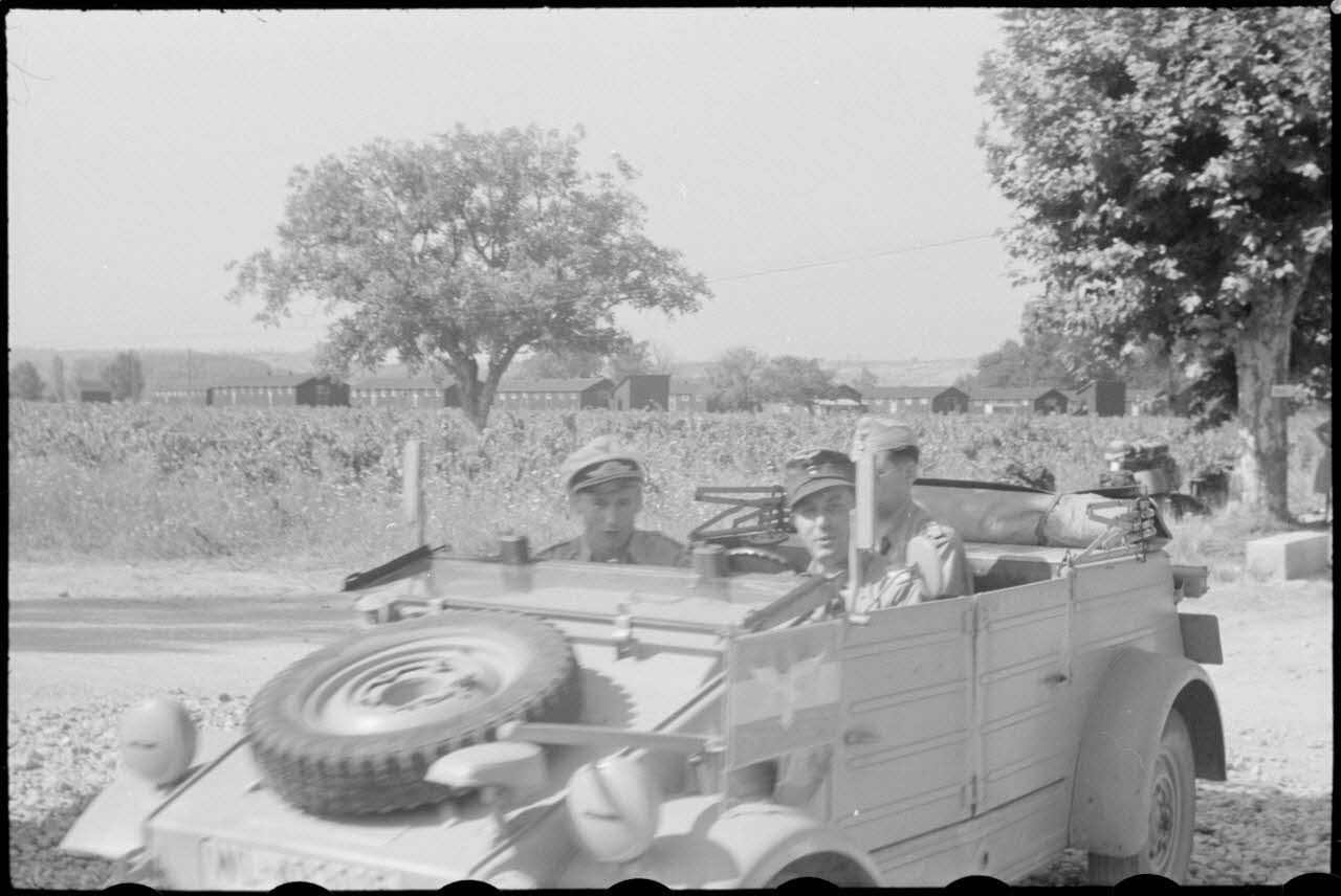 Un colonel (Oberst) à bord d'une Volkswagen type 82 Kübelwagen.