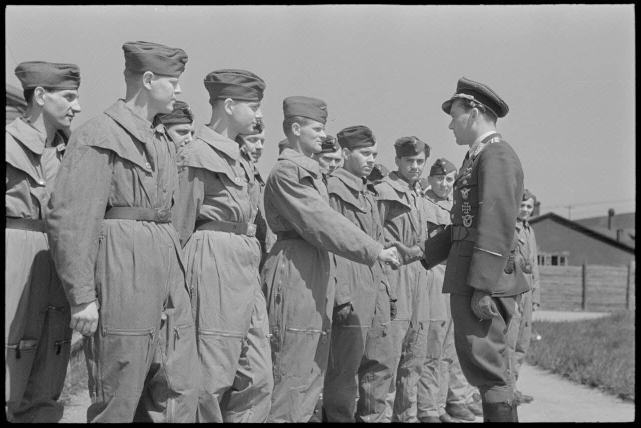 Un capitaine (Hauptmann) du Lehrgeschwader 1 (LG1) passe en revue les aviateurs de son unité avant de les féliciter.