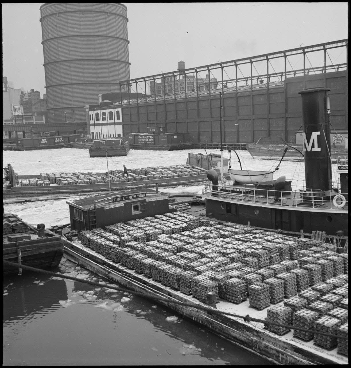 Dans le port de New-York pris par les glaces, des chalands transportent des caisses contenant des avions destinés aux Alliés, qui vont être chargées sur des cargos.