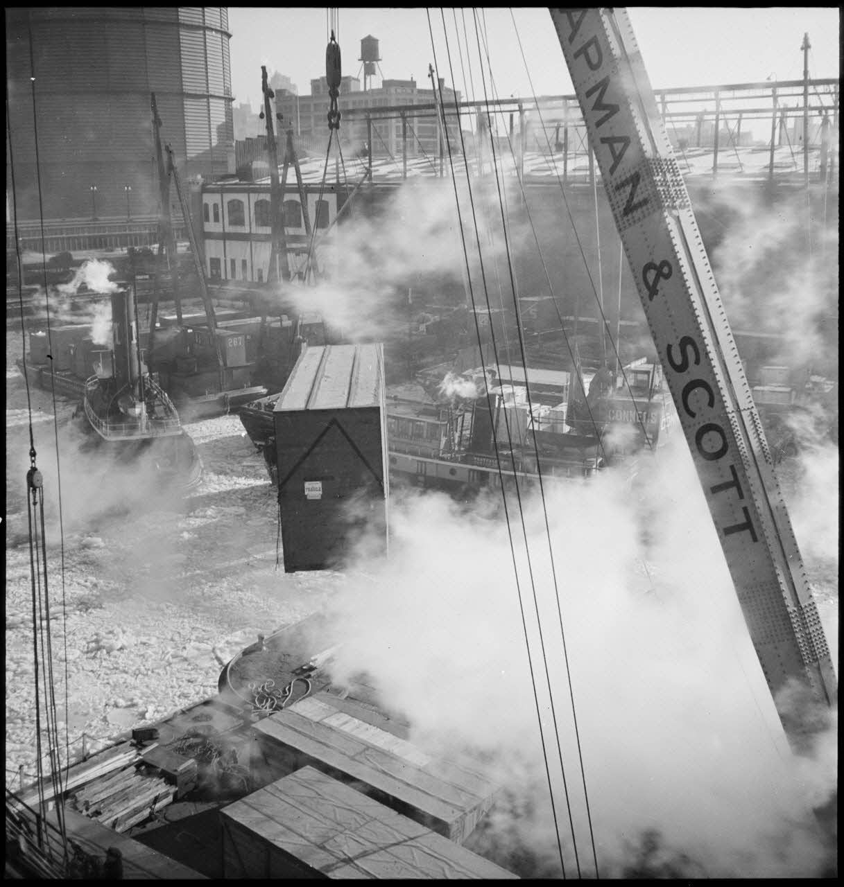 Dans le port de New-York pris par les glaces, des chalands transportent des caisses contenant des avions destinés aux Alliés, qui vont être chargées sur des cargos.