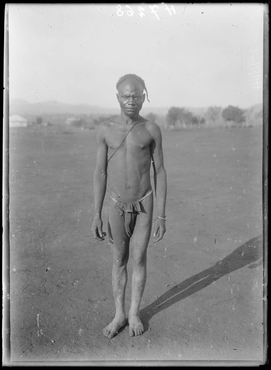 Portrait en pied d'un homme appartenant à l'ethnie des Mabila, vêtu d'un pagne et coiffé d'une petite tresse.
