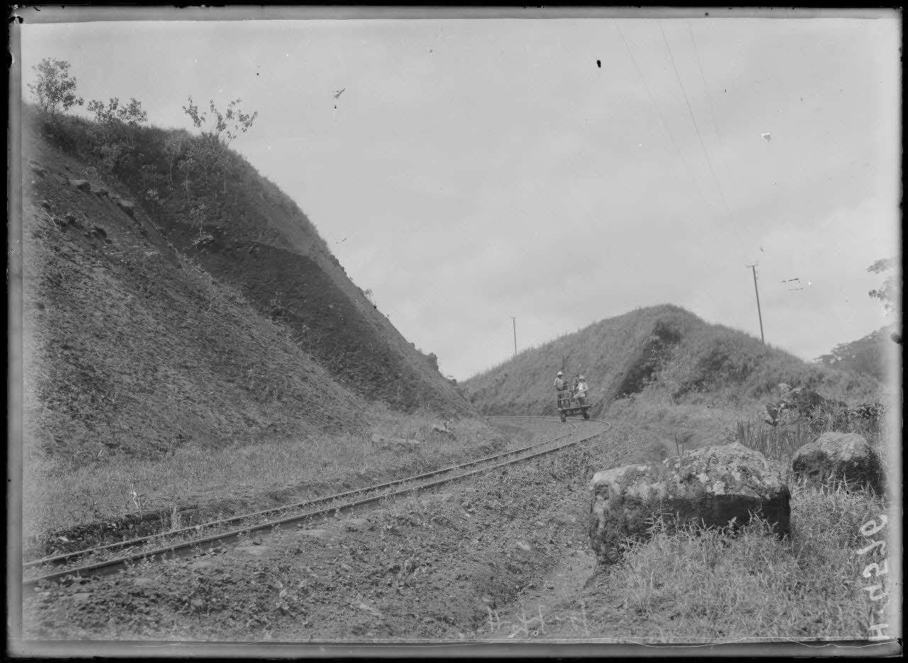 Au km 143 de la ligne du Chemin de fer du Nord, la voie ferrée passe dans une tranchée. Un européen et deux camerounais circulent sur une draisine.