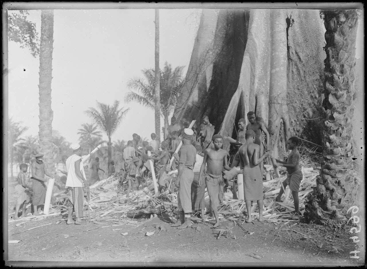 Dans une plantation de Njombé, au pied d'un fromager, des indigènes coupent des troncs de bananiers afin d'en faire des protection pour les jeunes plants de tabac.