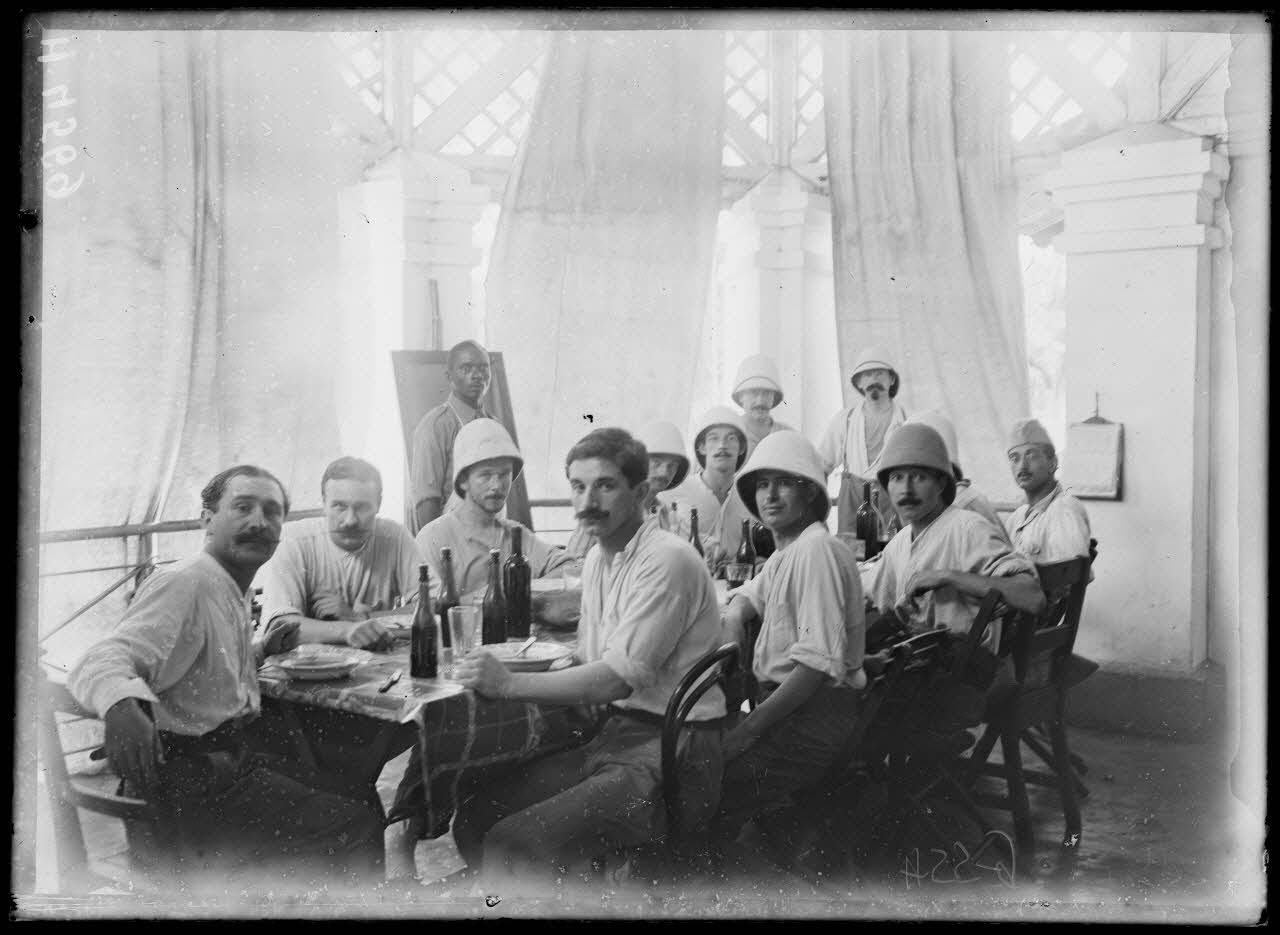 Après une interruption de près d'un mois, l'opérateur reprend son travail et photographie le repas des malades à l'hôpital de Douala. Un groupe d'européens tous coiffés du casque colonial est attablé devant de la porcelaine sous les claustras de la galerie du 1er étage.