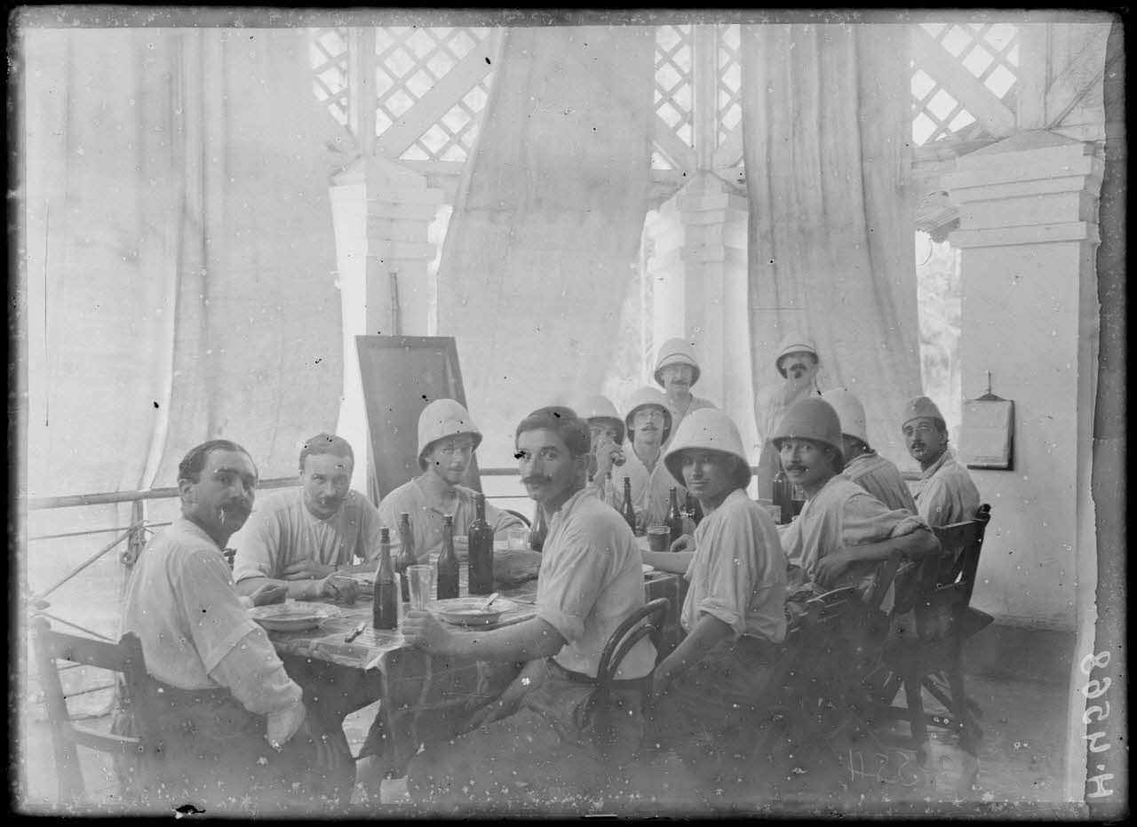 Après une interruption de près d'un mois, l'opérateur reprend son travail et photographie le repas des malades à l'hôpital de Douala. Un groupe d'européens tous coiffés du casque colonial est attablé devant de la porcelaine sous les claustras de la galerie du 1er étage.