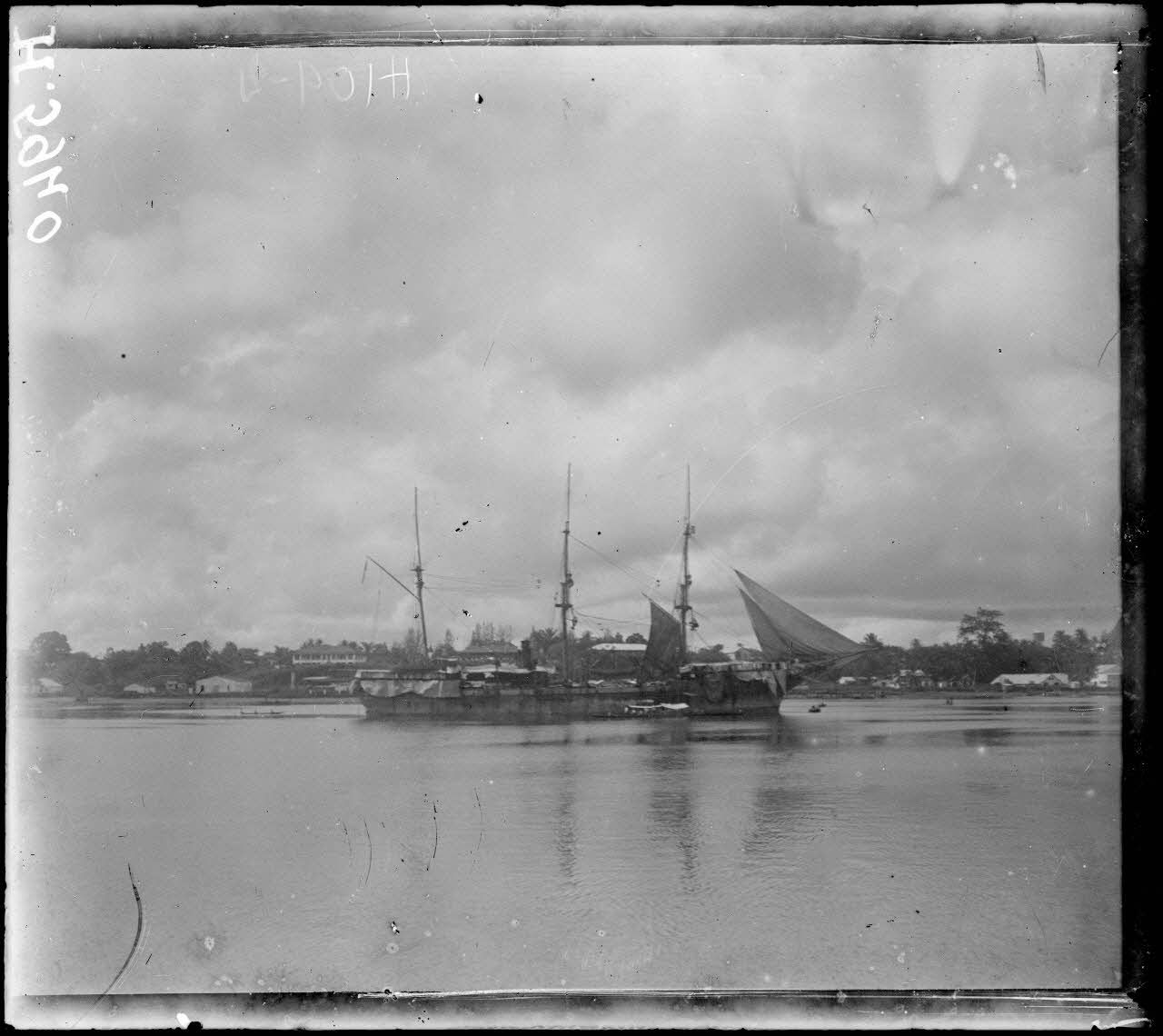 Après son voyage vers le nord, l'opérateur est redescendu à Douala et photographie le gouverneur embarquant sur le trois-mats "Vaucluse". Remontant le Wouri jusqu'à Yabassi, il prend des clichés des factoreries établies sur les rives du fleuve. Des indigènes vont au secours d'une chaloupe échouée sur un haut-fond, tandis qu'une chaloupe à vapeur remonte le fleuve (plaque manquante). A Nono, le transporteur "Sokoto" charge son bois.