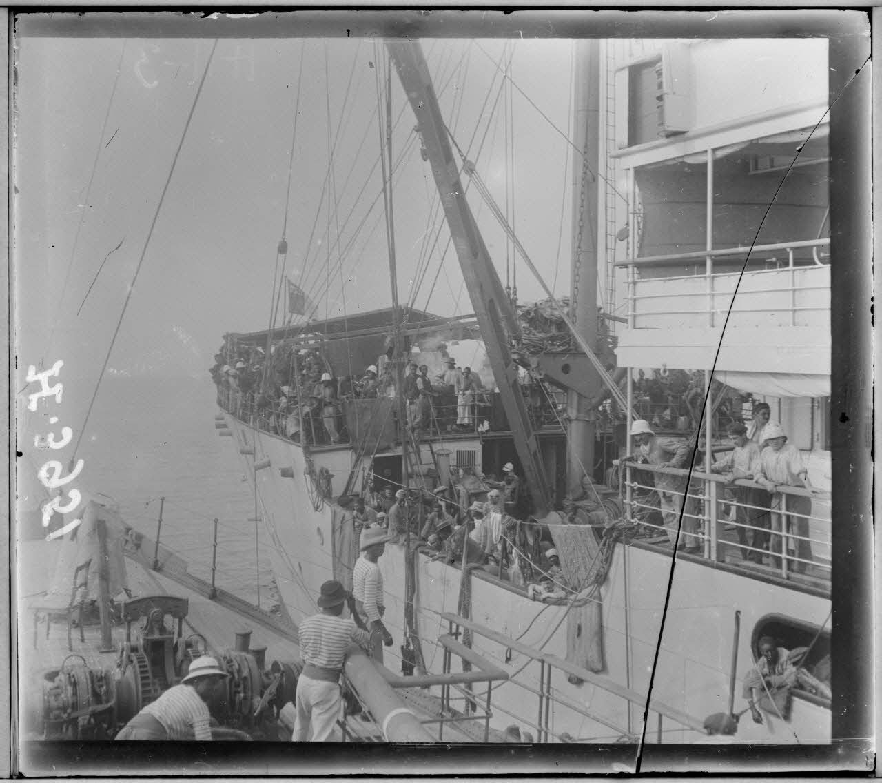 Rade de Suelaba. La proue de l'"Afrique". Tirailleurs rentrant au Sénégal. [légende d'origine]