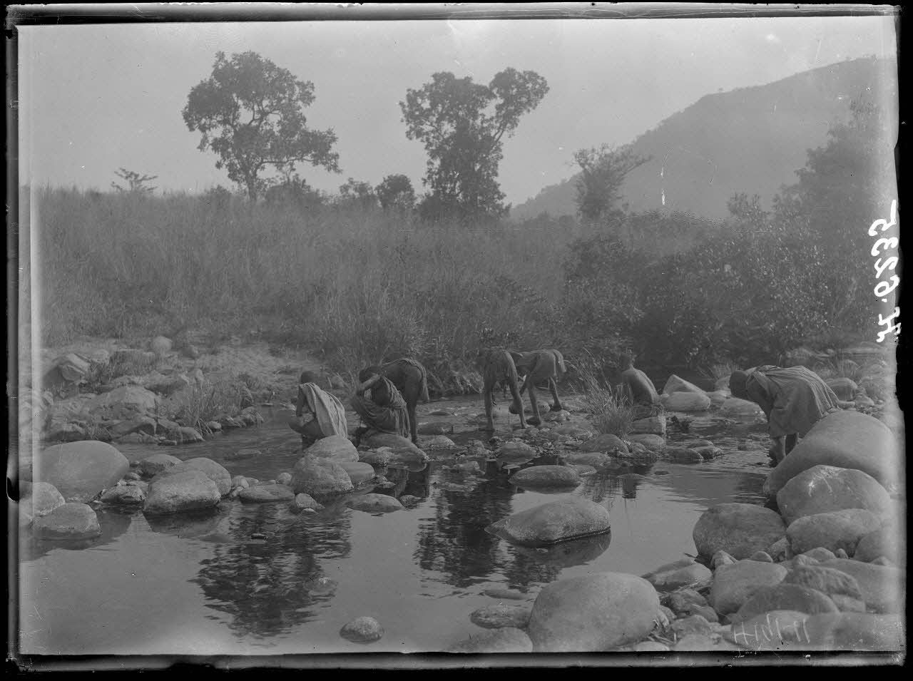 Route de N'Gaoundéré à Garoua. Porteurs se lavant dans le mayo Matoléro.