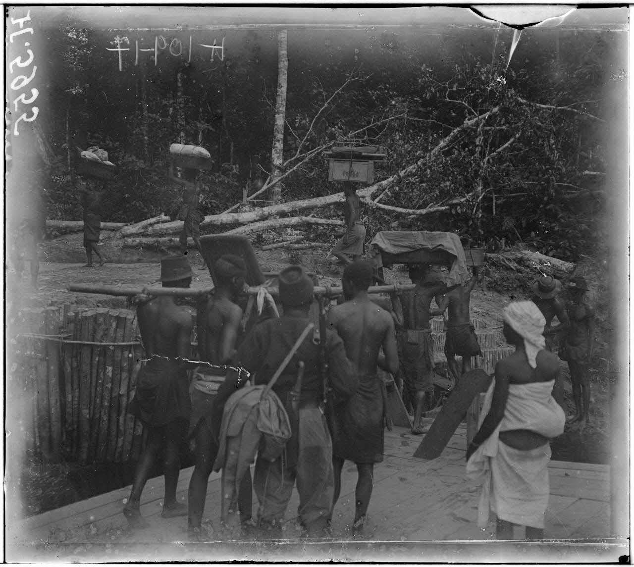 Le bac accoste sur la rive sud du Nyong ; les porteurs de la mission photographique déchargent le matériel : caisses, chaise à porteur, chaise longue...