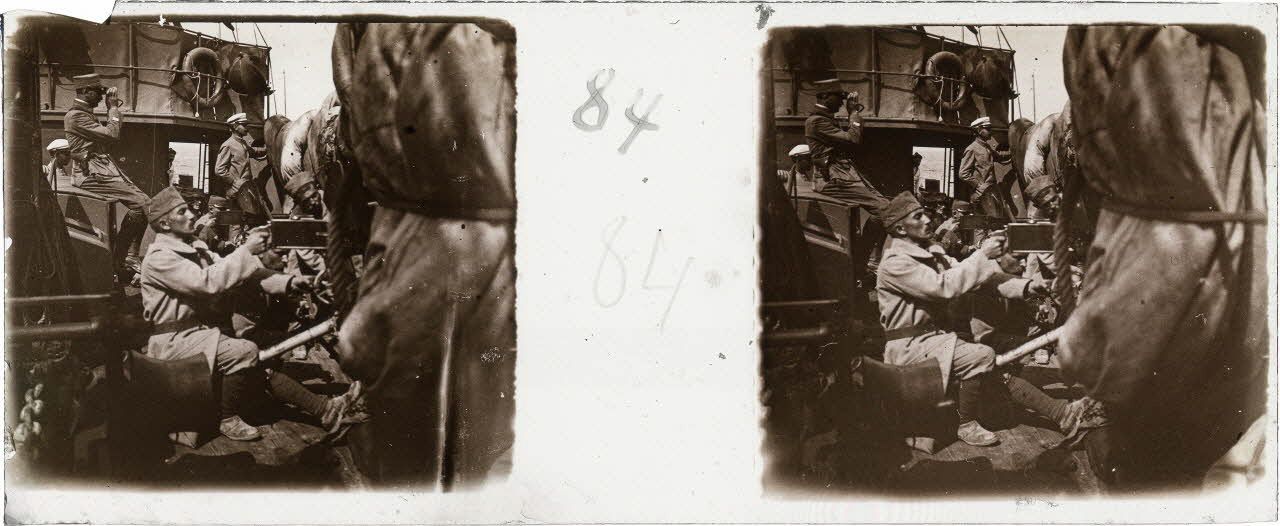 [Campagne des Dardanelles, 1915. Les soldats sont installés à des postes de mitrailleuses sur un bâtiment de guerre].