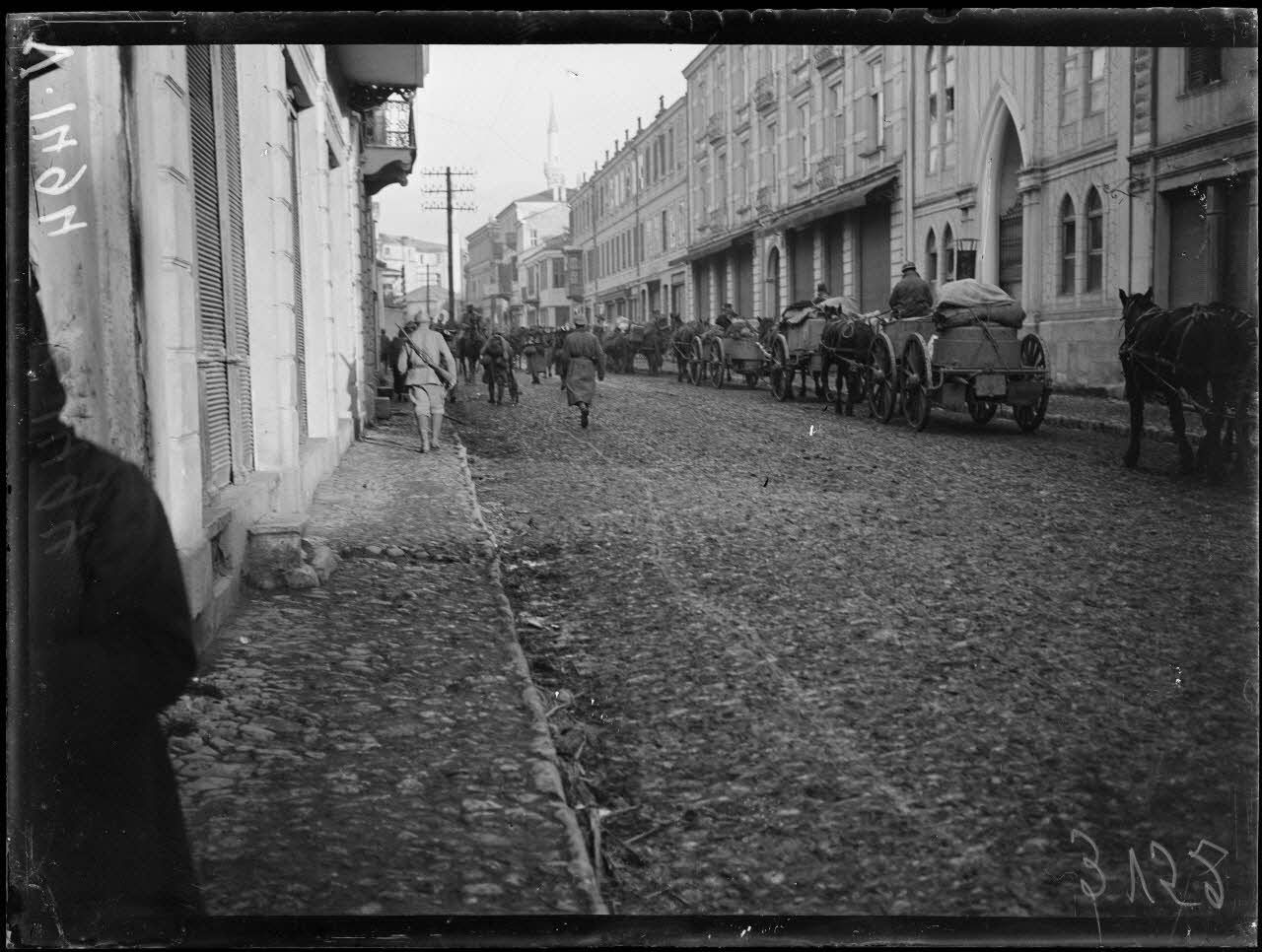 Monastir. Les premières troupes françaises passant dans la rue principale. [légende d'origine]