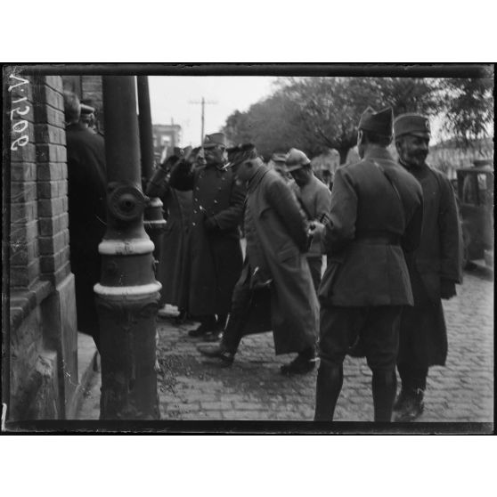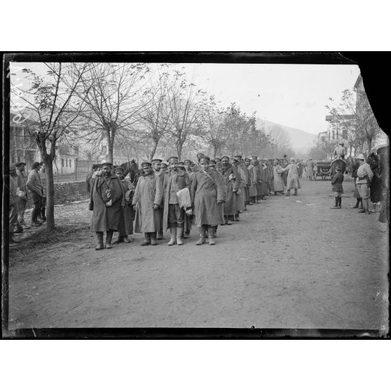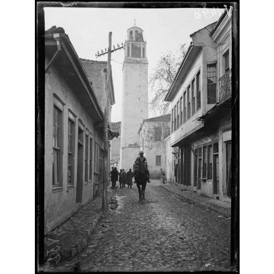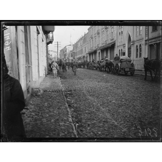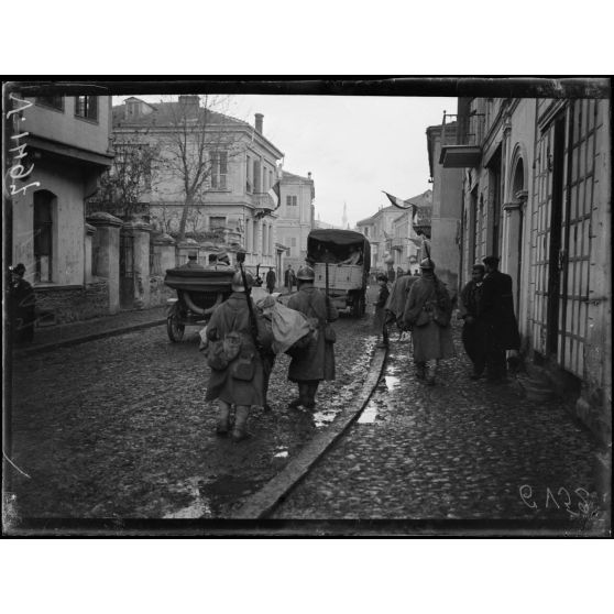 Les prisonniers bulgares regardent les troupes et automobiles françaises pénétrer la ville de Macédoine, ses rues et sa tour carrée.