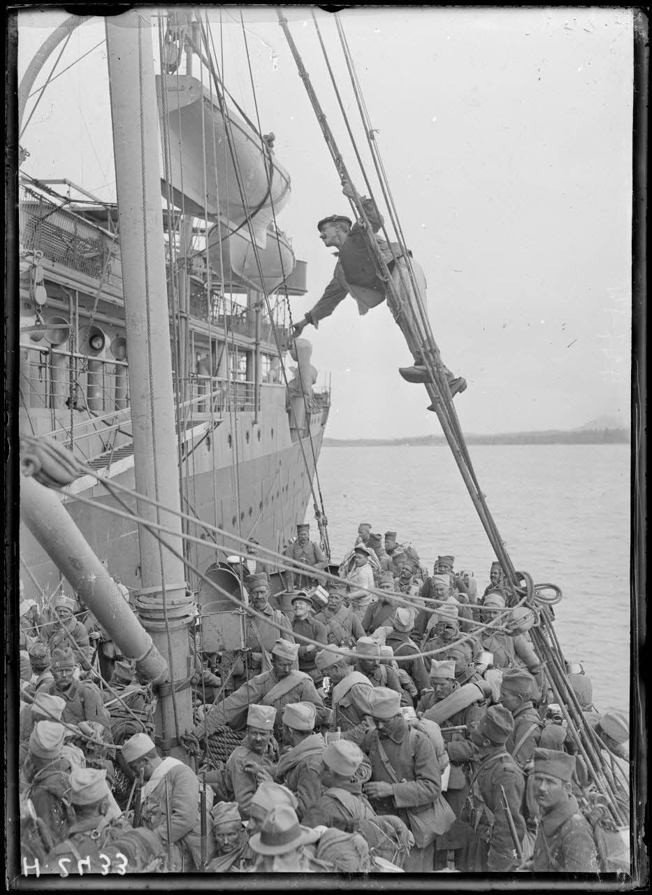 Rade de Govino. A bord du Miquelon. Au moment du départ du Miquelon les serbes crient "vive la France".