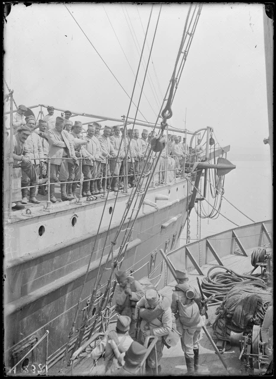 Le 1er mai, les troupes d'artillerie de montagne de la division du Timok et des fantassins de la division de la Drina attendent à leur tour l'embarquement sur le "Corbière" (qui transborde les troupes sur le "Néra"), le "Melbourne" et le " Miquelon". Plus loin dans la baie, le cuirassé "Victor Hugo" attend sa prochaine manoeuvre.