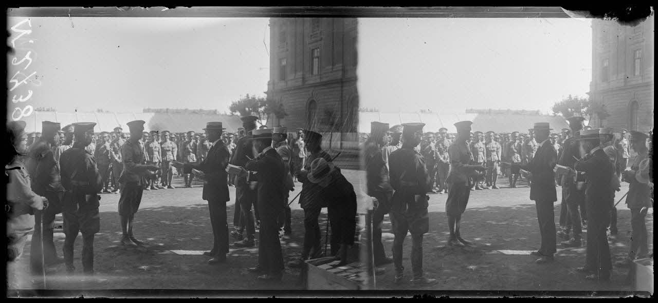 Marseille. Arrivée des troupes siamoises. Le prince Charvon, ministre du Siam, distribue des carnets souvenirs à des soldats. [légende d'origine]
