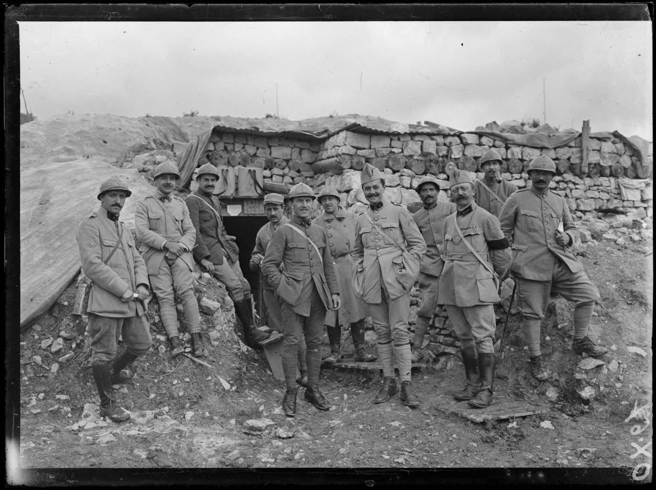 Cote 309 (Meuse). QG de l'artillerie du général Pauffin de Saint-Morel. L'aumonier Nivet, le lieutenant Jeauzac et l'interprète Roy.