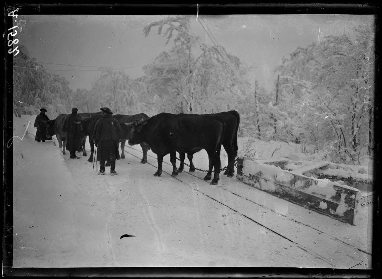 Le Tanet. (Près de la ferme). Attelage de boeufs trainant le traineau chasse-neige. [légende d'origine]