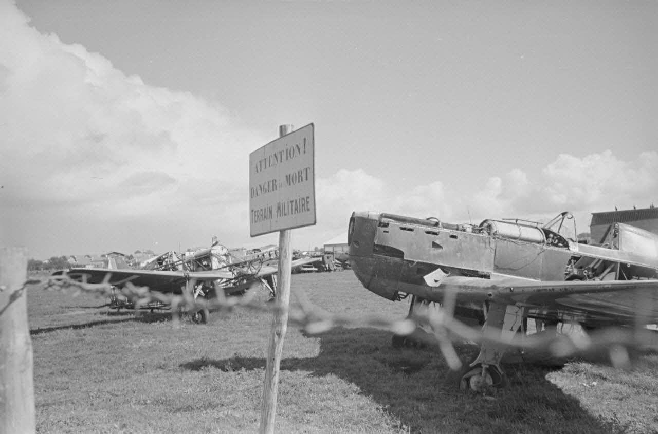 Le terrain d'aviation de Royan-Médis, les carcasses d'avions de chasse MS-406 et un canon de DCA (40 mm Bofors).
