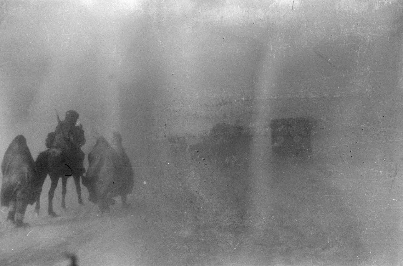 Le reportage présente deux aspects du front, les activités d'un terrain d'aviation d'une part et une tempête de neige sur une route glacée d'autre part.