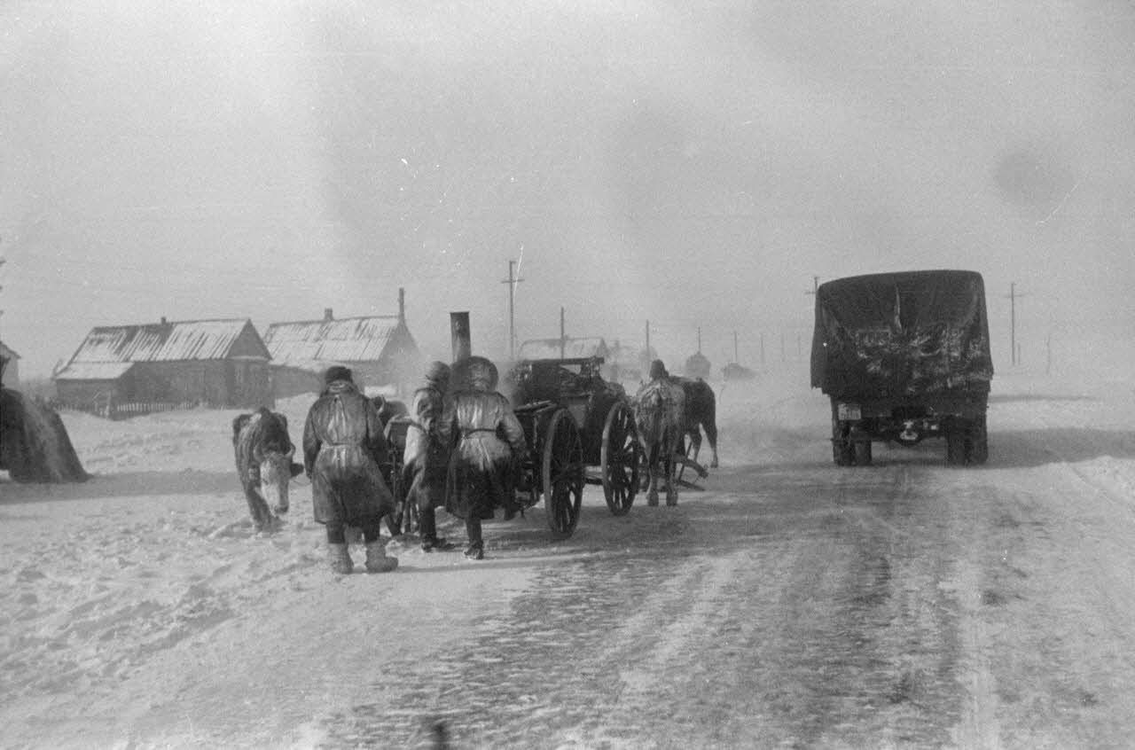 Sur un terrain d'aviation enneigé, activités de la Luftwaffe et sur une route glacée, la retraite allemande.