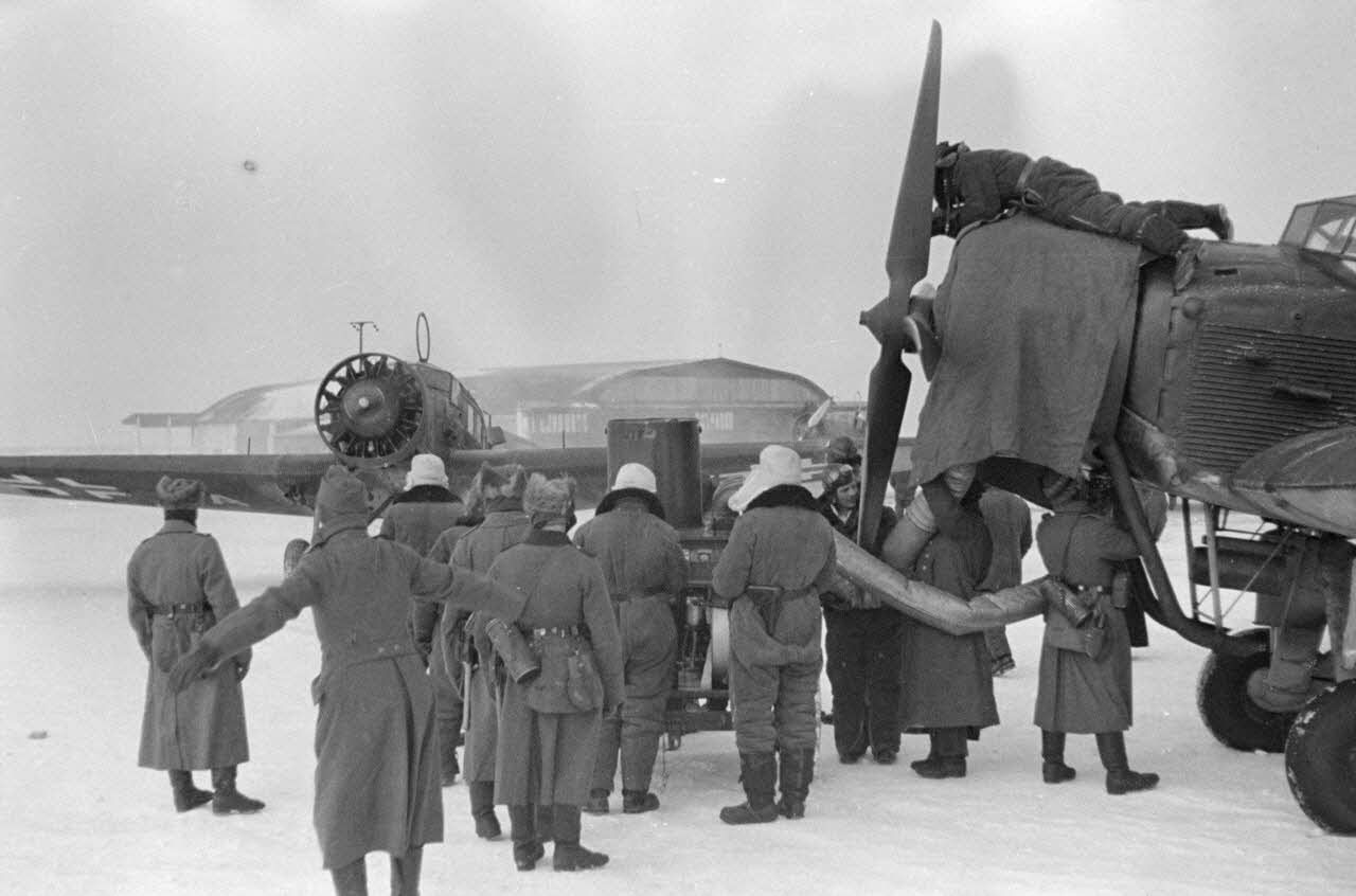 Sur un terrain d'aviation enneigé, activités de la Luftwaffe et sur une route glacée, la retraite allemande.